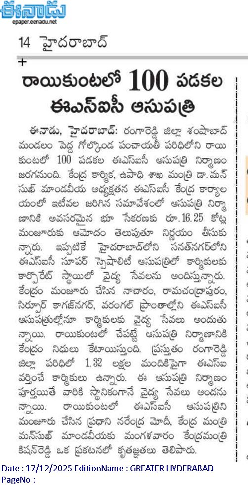 రాయికుంట లో 100 పడకల ఈ.ఎస్.ఐ.సి. ఆసుపత్రి.