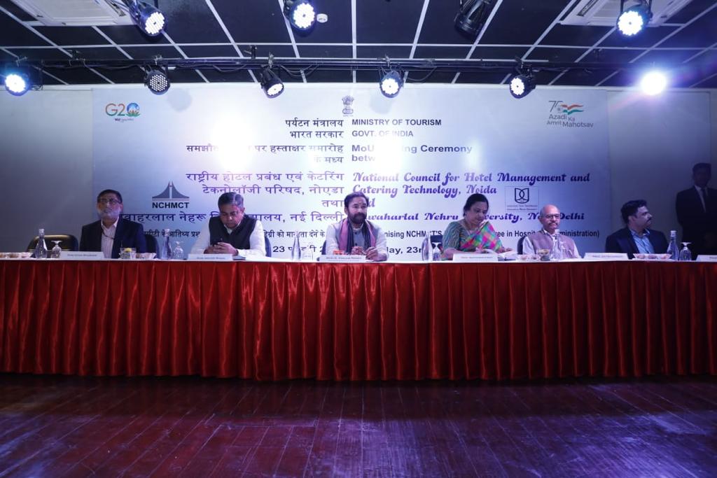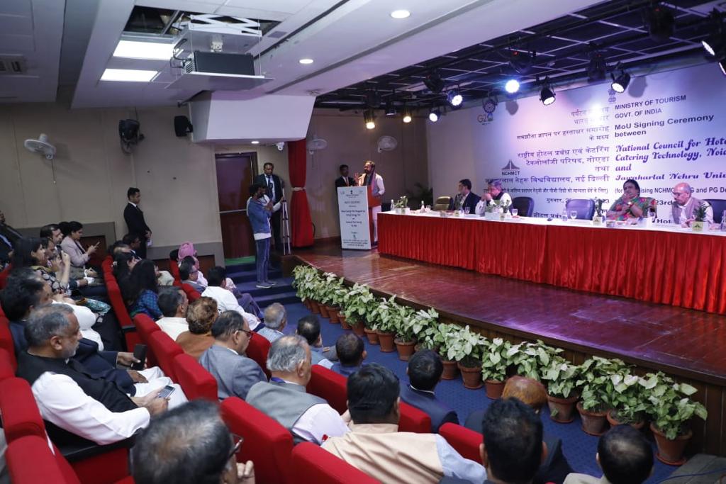At the MoU signing ceremony between the National Council for Hotel Management and Catering Technology and the JNU Official 50 at the Indian Institute of Hotel Management, Pusa. The MoU will recognise NCHMCT’s flagship UG and PG Degree Programmes in Hospitality by the JNU, leading to the award of degrees to the pass-out students of NCHMCT courses run by the JNU from the 2023–24 academic year. Students of NCHMCT will benefit from University recognition, which will open new employment opportunities for students both in India and across the globe. Further, it will attract foreign nationals and NRIs.
