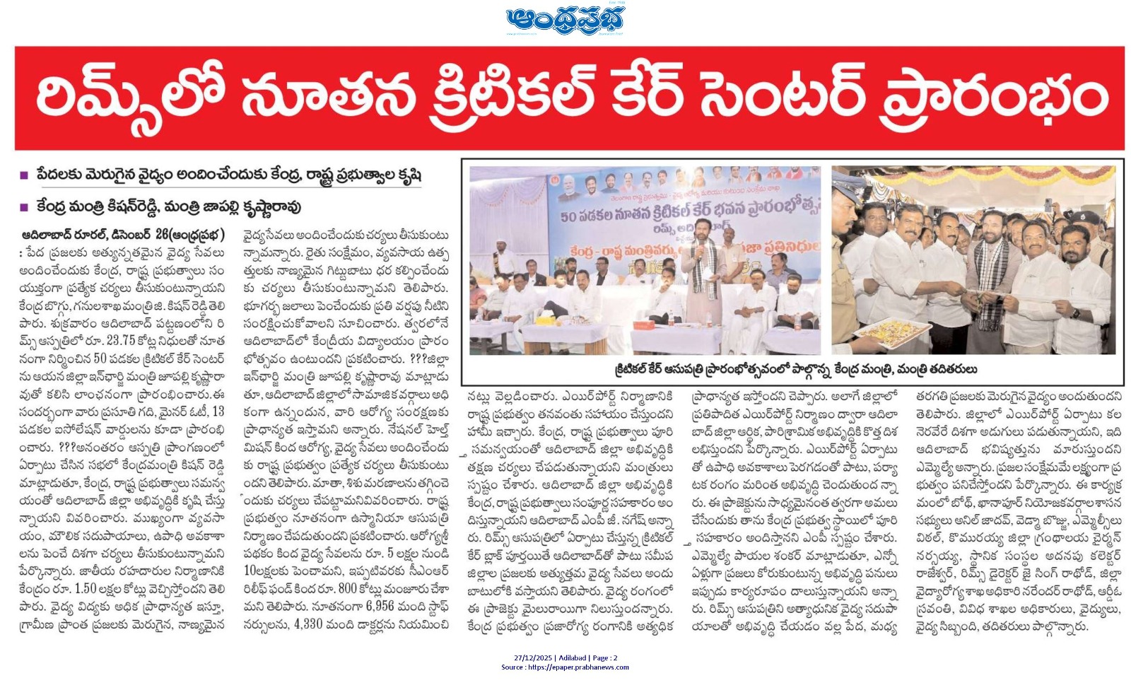 రిమ్స్ లో నూతన క్రిటికల్ కేర్ సెంటర్ ఏర్పాటు