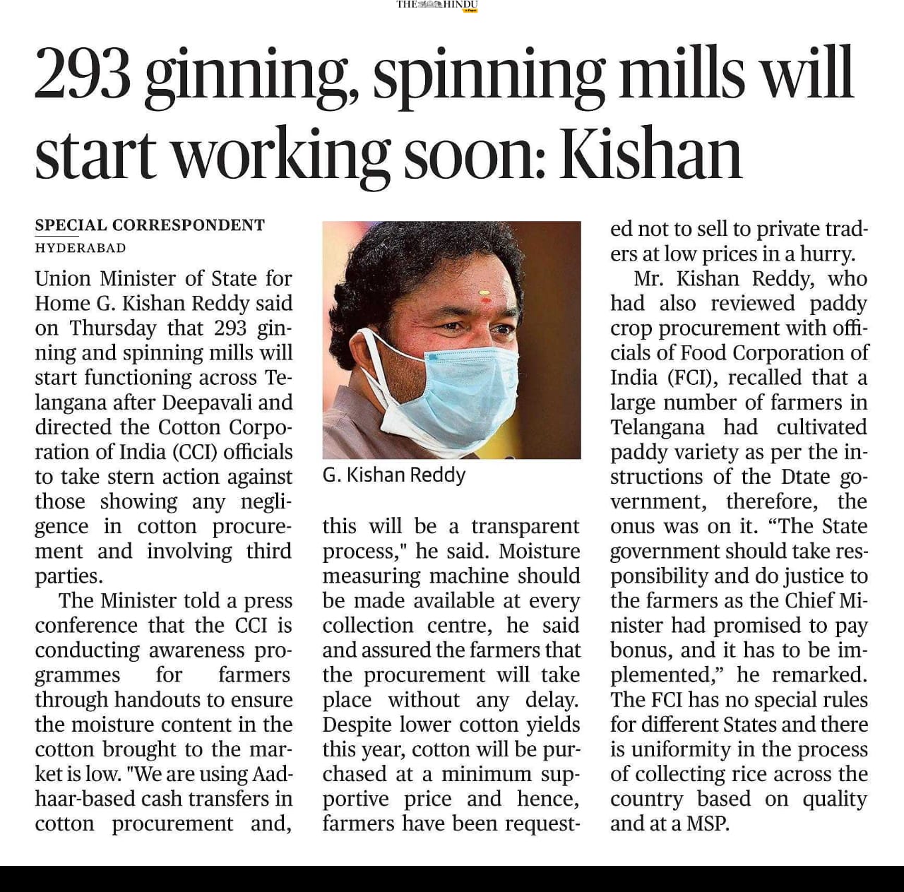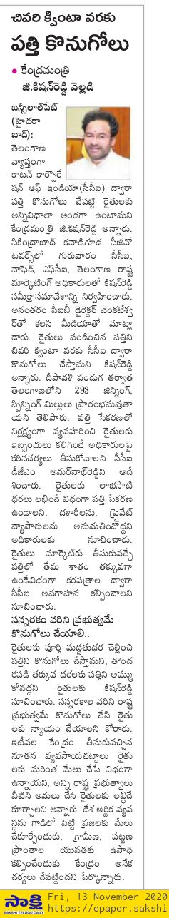 రైతుల కోసం విమానాలు పెడతాం - హోం శాఖ సహాయ మంత్రి జి కిషన్ రెడ్డి - ఈనాడు - 22.04.2020