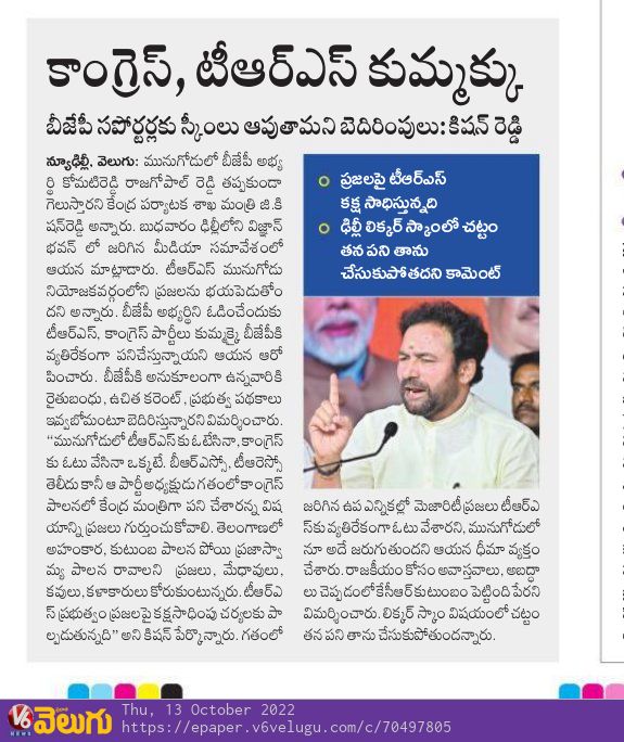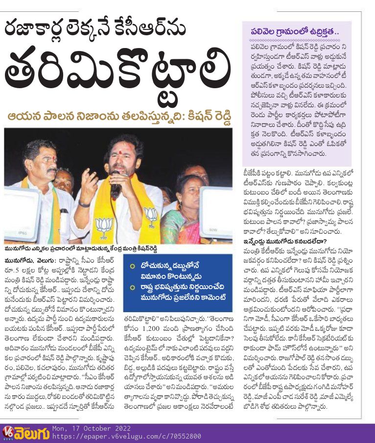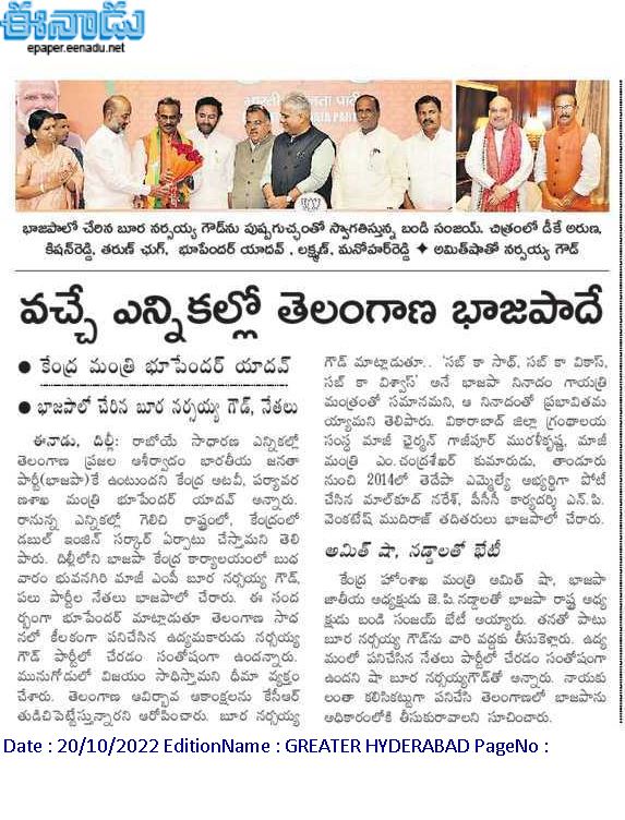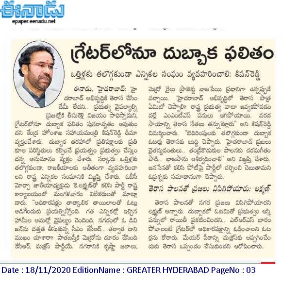 తెలంగాణ లో తెరాసకు ప్రత్యామ్నాయం భాజపానే : కేంద్ర హోం శాఖ సహాయ మంత్రి జి. కిషన్ రెడ్డి – ఈనాడు 20.10.2019