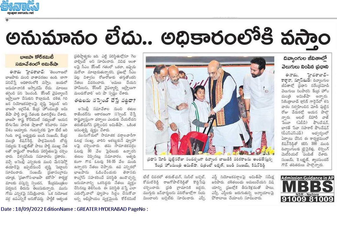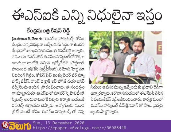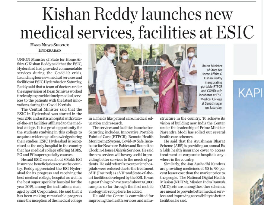 బీమా లేనివారికీ ఈ ఎస్ ఐ వైద్య సేవలు : కేంద్ర హోం శాఖ సహాయ మంత్రి జి. కిషన్ రెడ్డి – ఈనాడు 22.08.2019