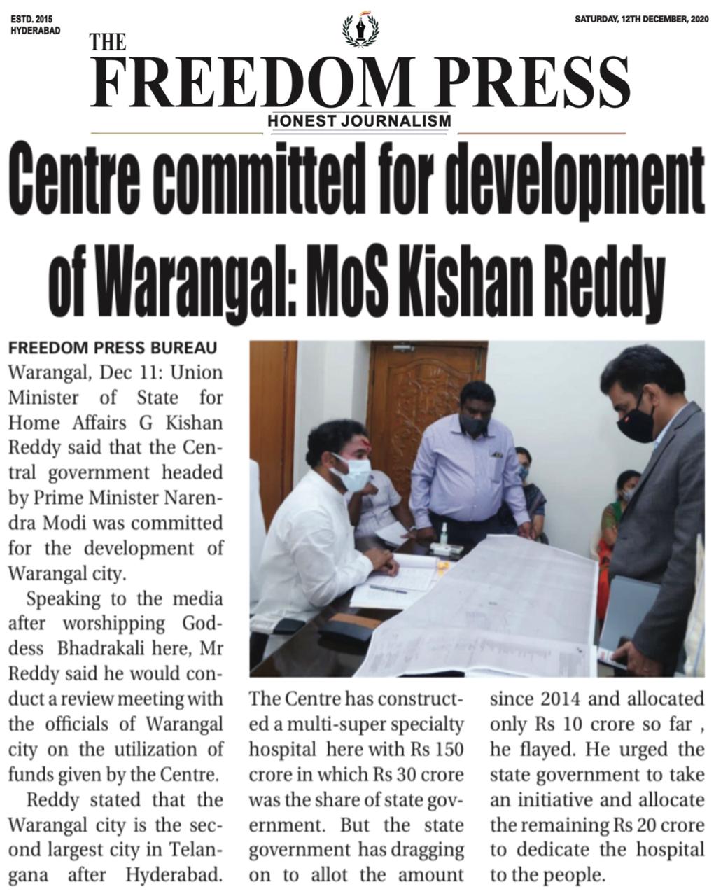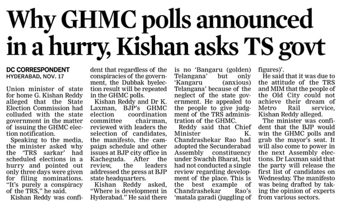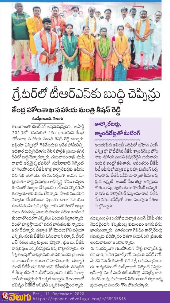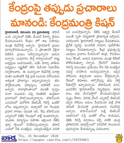 ఎన్నికలను పారదర్శకంగా నిర్వహించాలి : కేంద్ర హోం శాఖ సహాయ మంత్రి జి. కిషన్ రెడ్డి – 10.01.2020 నమస్తే తెలంగాణ