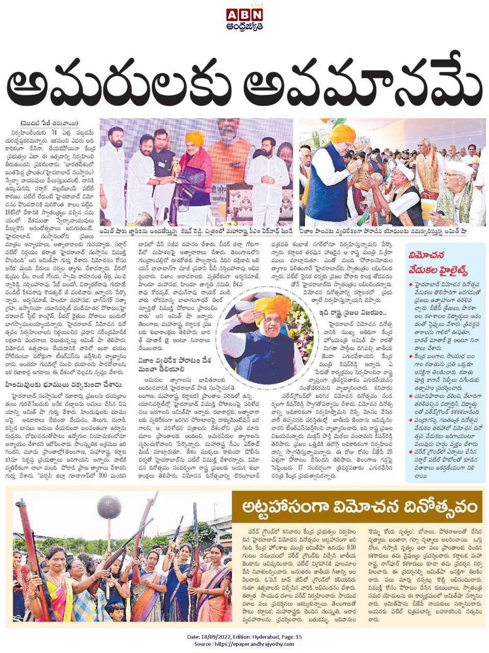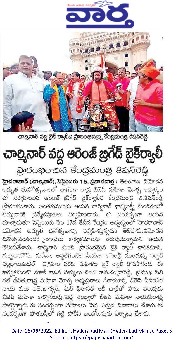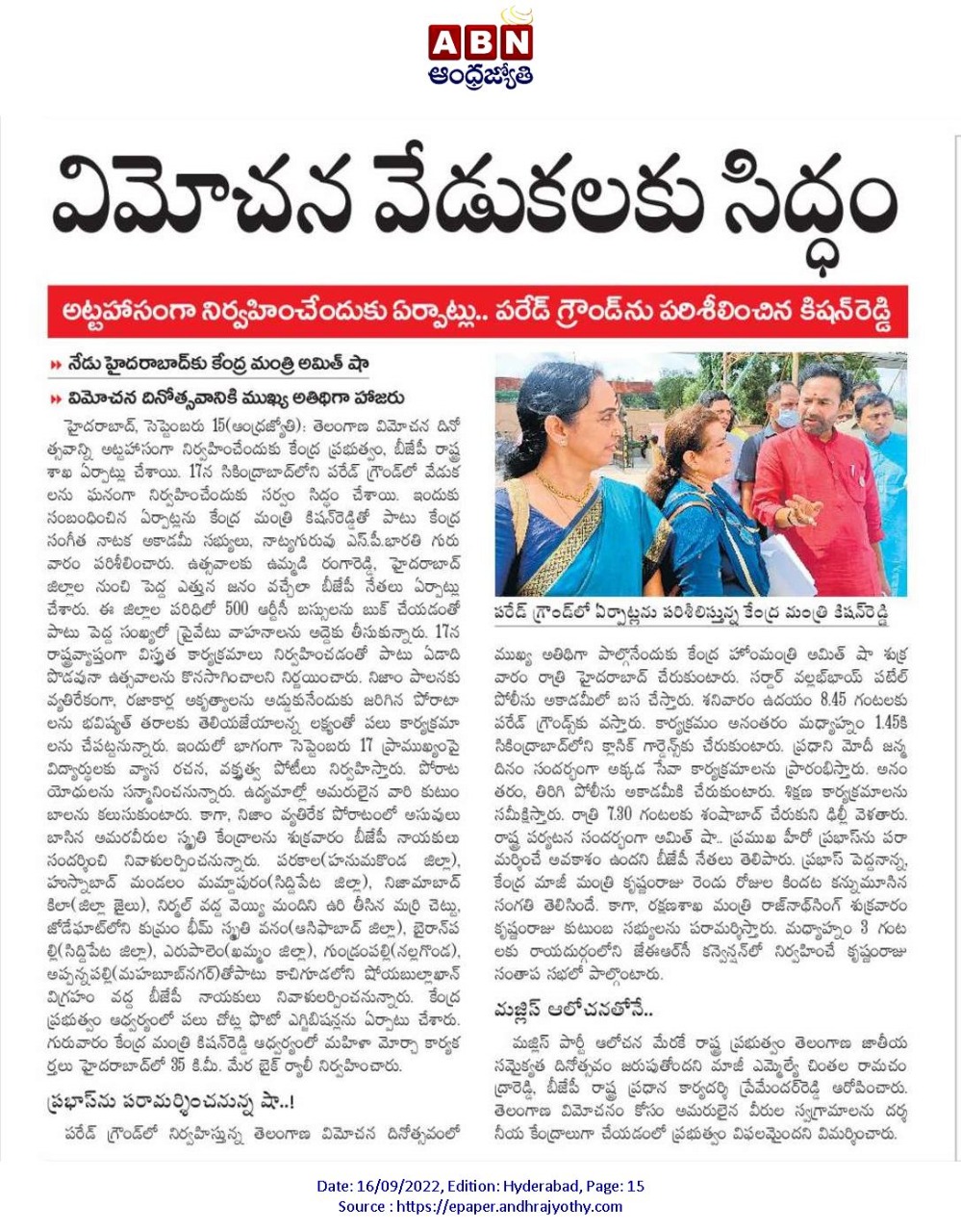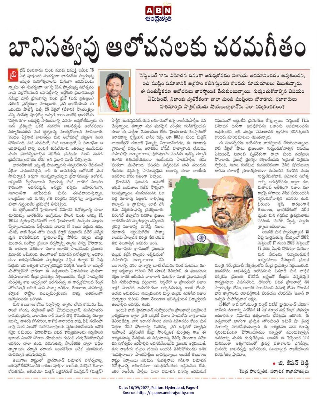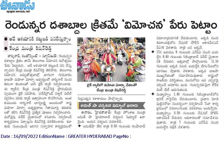 మన చరిత్ర భావి తరాలకు స్పూర్తి : కేంద్ర హోం శాఖ సహాయ మంత్రి జి. కిషన్ రెడ్డి - నమస్తే తెలంగాణ 21.09.2019