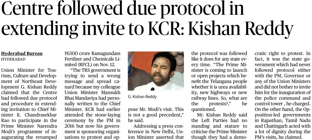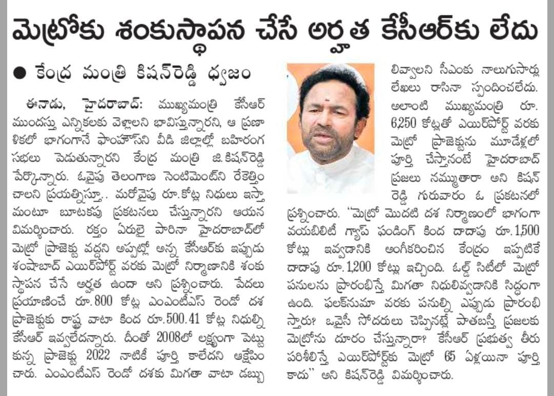 మెట్రో ప్రారంబోత్సవంలో ప్రోటోకాల్ పాటించ రా : : కేంద్ర హోం శాఖ సహాయ మంత్రి జి. కిషన్ రెడ్డి – 15.02.2020 ఆంధ్రజ్యోతి