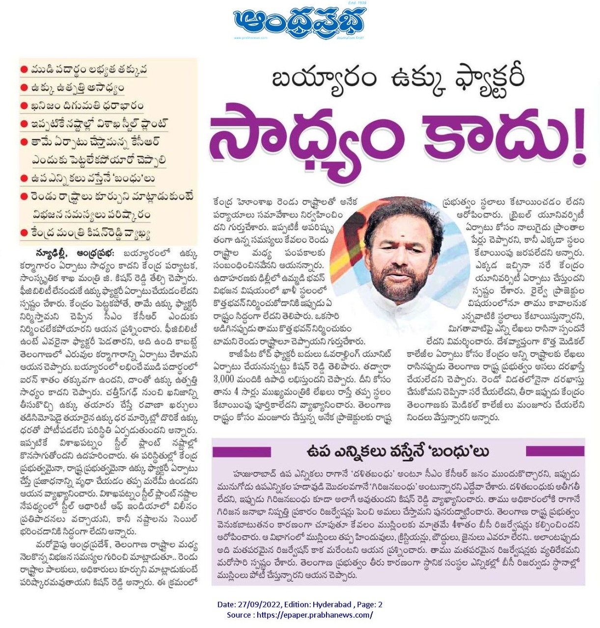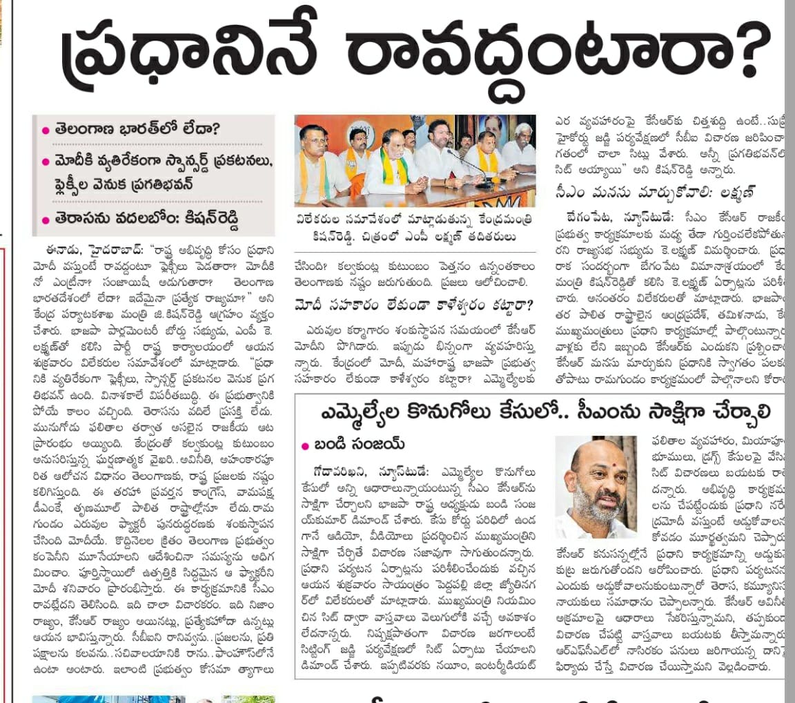 సేఏఏ పై కేసీఆర్ కు సొంత అభిప్రాయం లేదు : కేంద్ర హోం శాఖ సహాయ మంత్రి జి. కిషన్ రెడ్డి – 25.02.2020 ఆంధ్రజ్యోతి