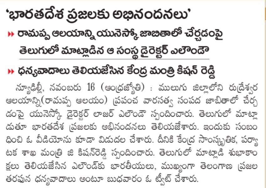 రామప్ప దేవాలయాన్ని యునెస్కో జాబితాలో చేరిక పై అభినందనలు