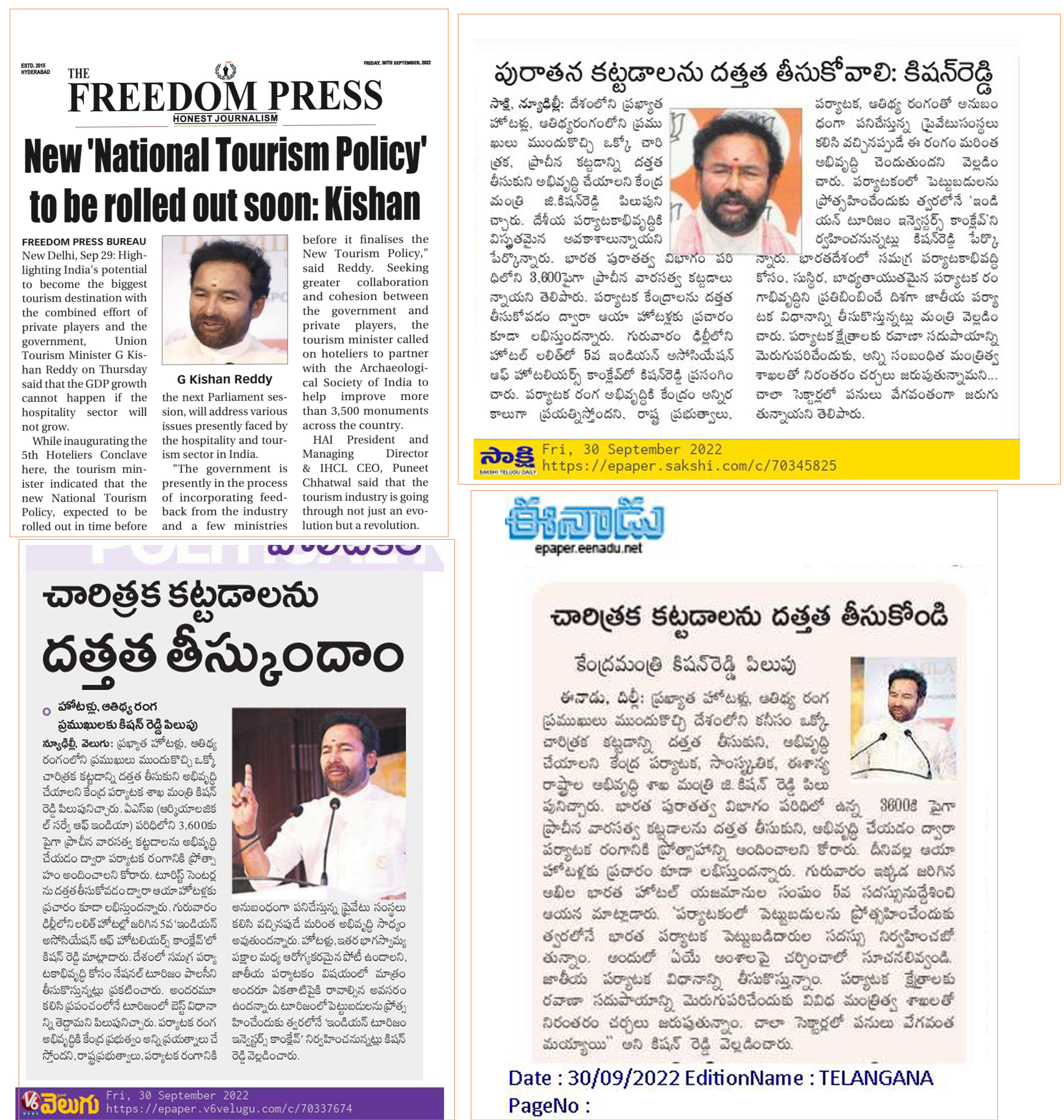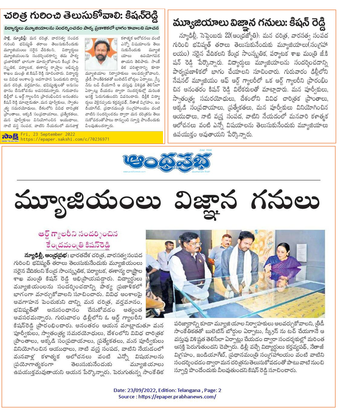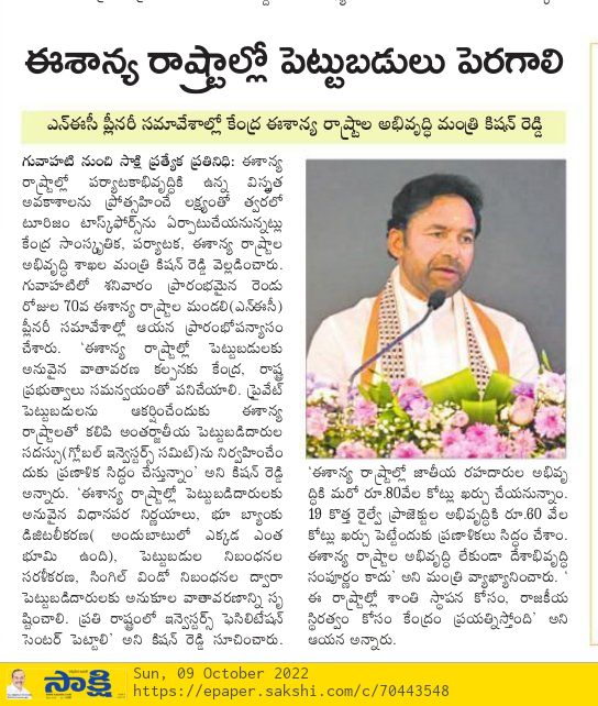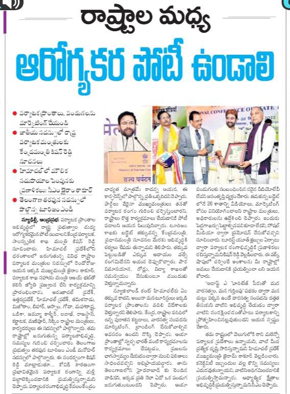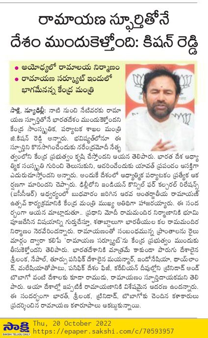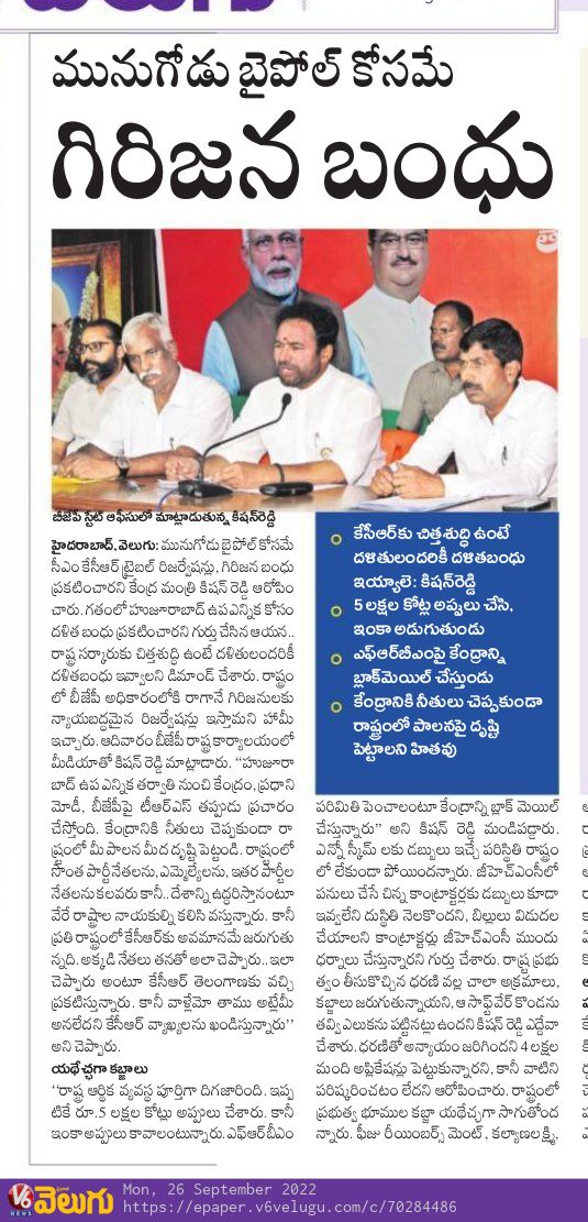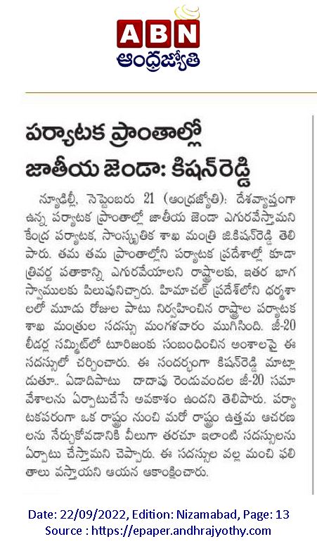 తెలంగాణకు పూర్వ వైభవం రావాలి : కేంద్ర హోం శాఖ సహాయ మంత్రి జి. కిషన్ రెడ్డి - ఆంధ్రజ్యోతి 21.09.2019