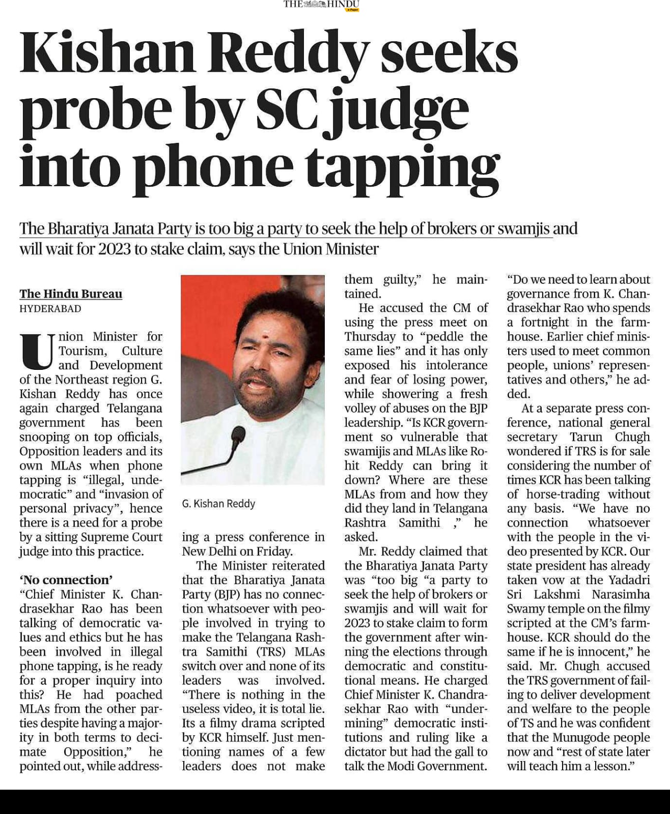 Kishan Reddy seeks probe by SC judge into phone tapping.
