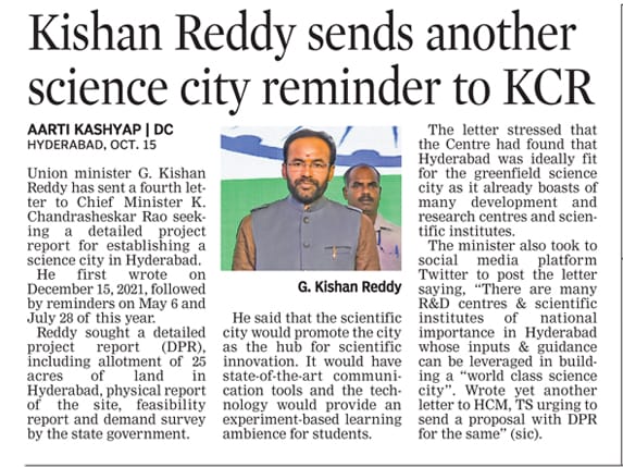 Kishan Reddy sends another Science City reminder to KCR