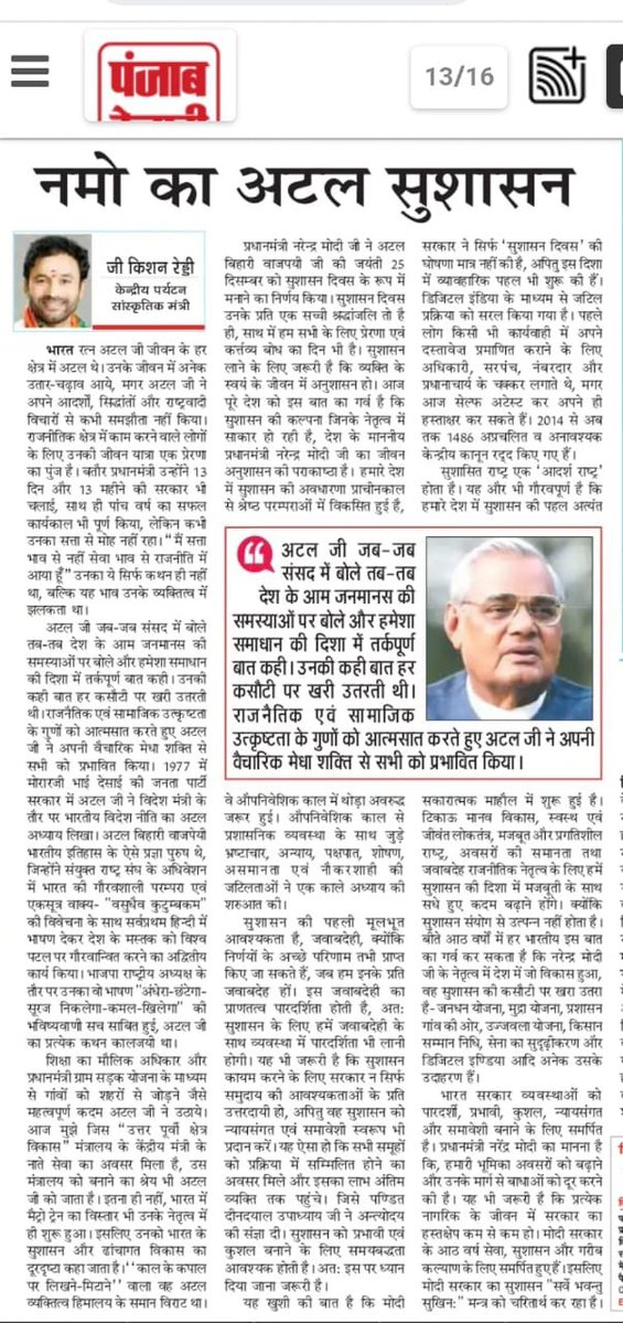 भारत रत्न पूर्व प्रधानमंत्री श्रद्धेय श्री अटल बिहारी वाजपेई जी की जन्म जयंती, "सुशासन दिवस" पर राष्ट्रीय हिंदी समाचार पत्र पंजाब केसरी में प्रकाशित मेरा आलेख - "नमो का अटल सुशासन"