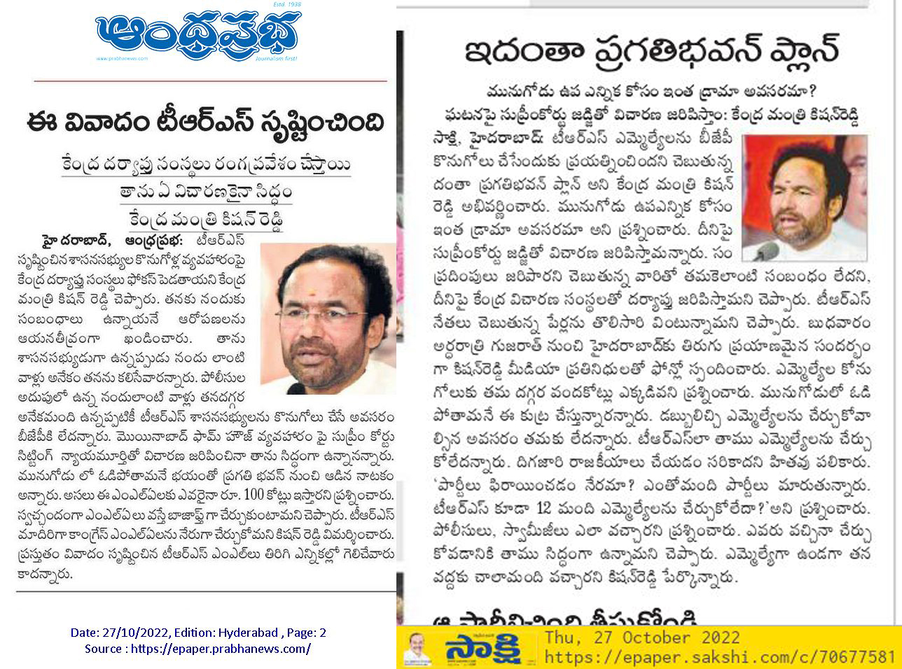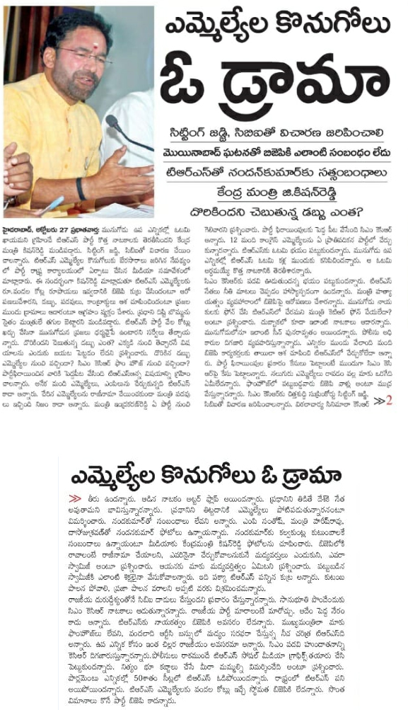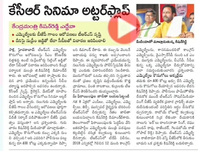Kishan Reddy demands CBI Probe in MLA poaching case.