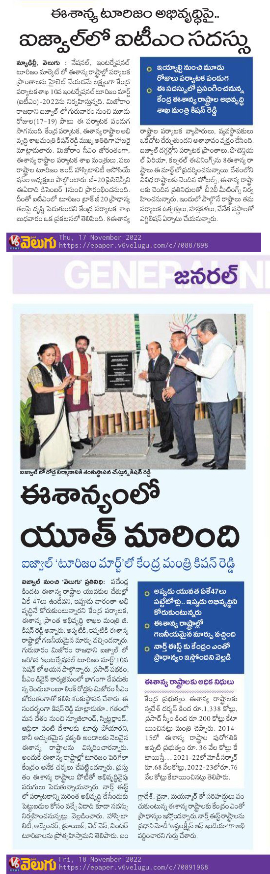 శాంతి స్థాపన ద్వారానే దేశాభివృద్ధి : కేంద్ర హోం శాఖ సహాయ మంత్రి - జి. కిషన్ రెడ్డి - వెలుగు 15.11.2019