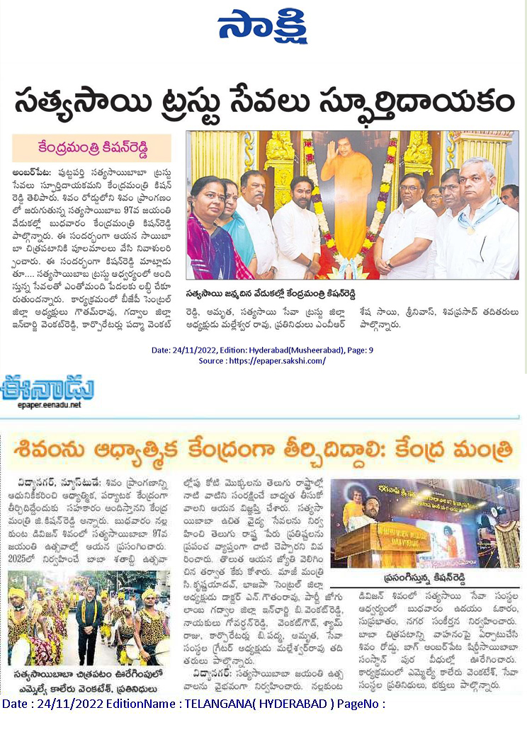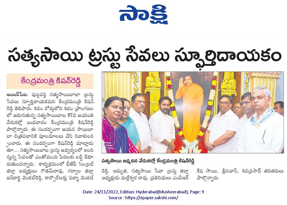 సత్య సాయి బాబా బోధనలు అనుసరణీయం : కేంద్ర హోం శాఖ సహాయ మంత్రి జి. కిషన్ రెడ్డి - సాక్షి 24.11.2019